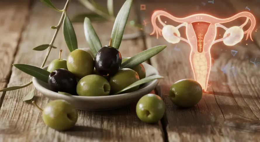 Oliven fördern die Gesundheit und Funktion der Eierstöcke. Sie enthalten Vitamine E und A und gesunde ungesättigte Fette. Eine italienische Studie hat herausgefunden, dass Frauen, deren Diät Oliven enthält, eine um 30 % niedrigere Gefahr haben Eierstockkrebs zu bekommen.