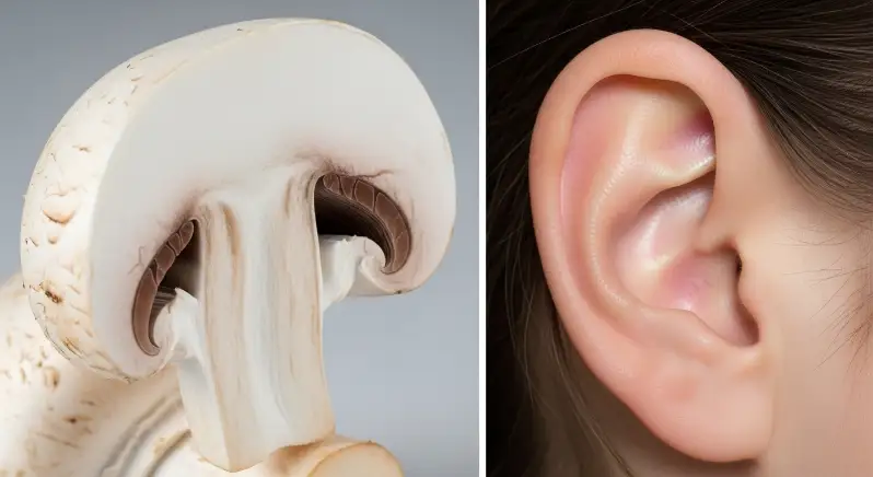 Ein aufgeschnittener Pilz hat das Aussehen und Ähnlichkeit eines menschlichen Ohrs, Pilze sind in der tat sehr gut für die Ohrgesundheit. Sie sind ein guter Lieferant von Vitamins D, das notwendig ist um die Gesundheit vom Gehör aufrecht zu erhalten.