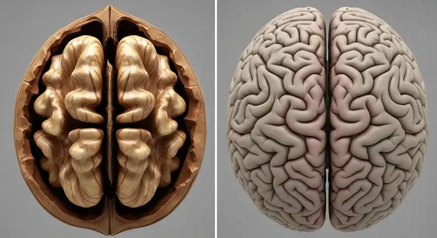 Eine Walnuss sieht aus wie ein kleines Gehirn, eine linke und rechte Hemisphäre, Groß und Kleinhirn.