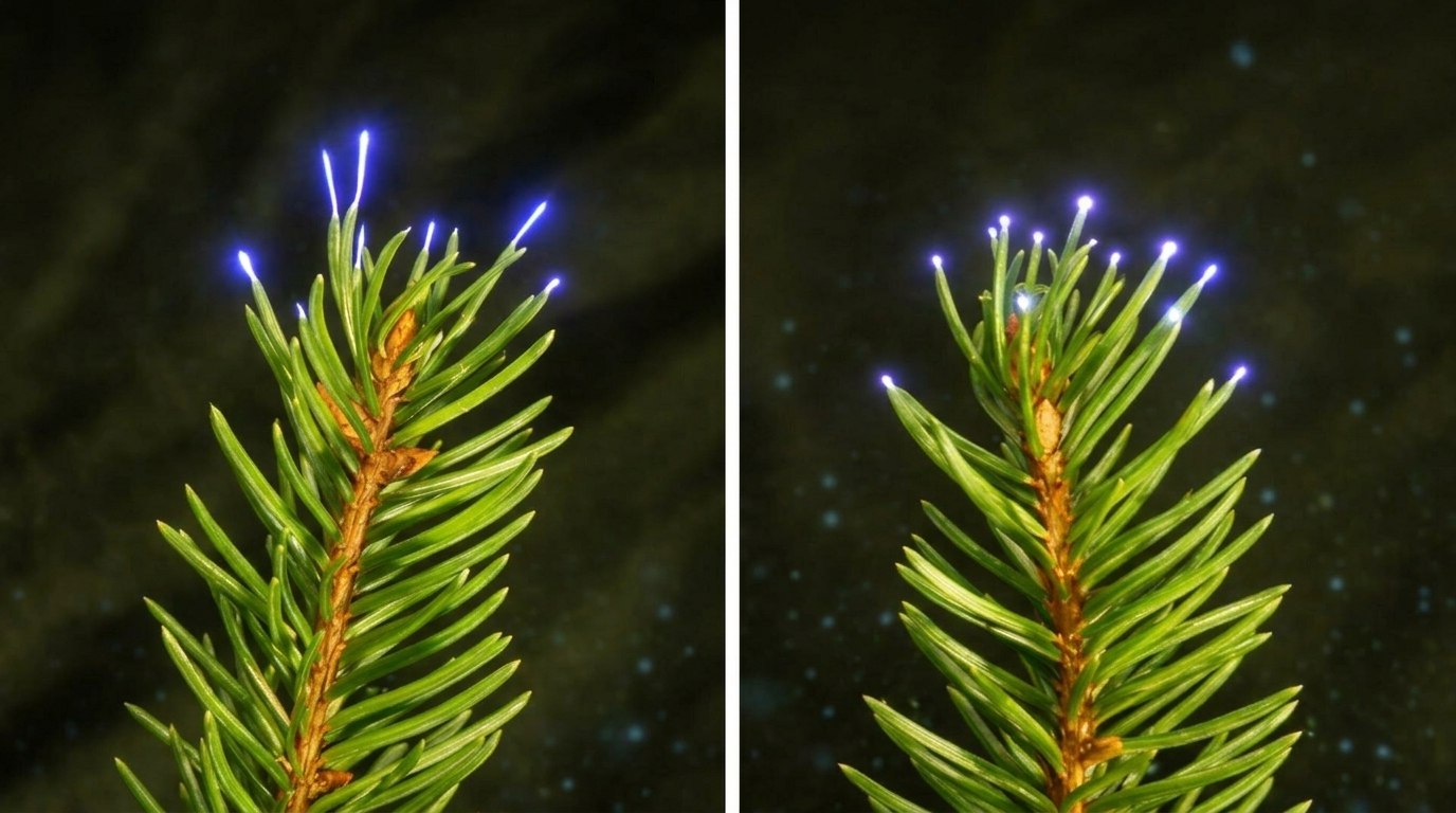 Immergrüne Nadelbäume, also Tannen, Fichten und Kiefern, sind mit ihren feinen, spitzen Nadeln besonders effizient darin, das elektrische Feld zu bündeln. Sie leuchten deutlich heller und intensiver als Laubbäume mit ihren breiteren, flacheren Blättern. Die Nadelgeometrie wirkt wie ein natürlicher Verstärker für die elektrische Energie des Gewitters.