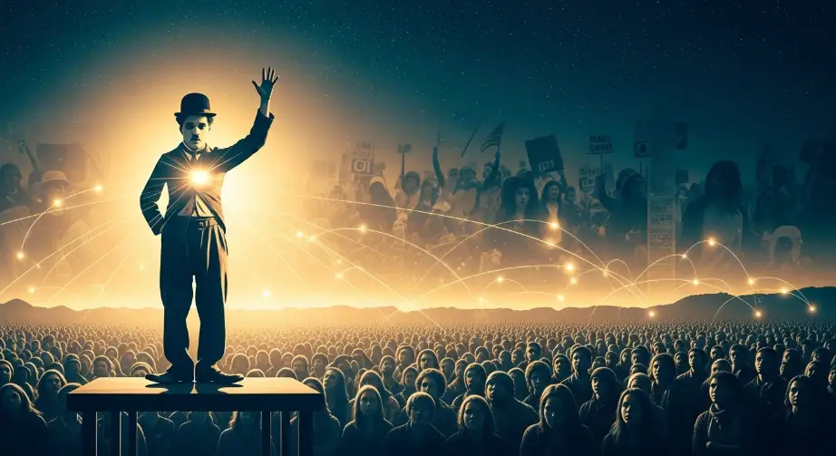 Am Ende ruft Chaplin der imaginären Menge zu: „Let us all unite! Let us fight for a new world!“ ein packender Appell an die Menschheit aufzustehen und für eine bessere Welt zu kämpfen.