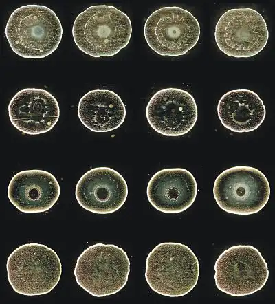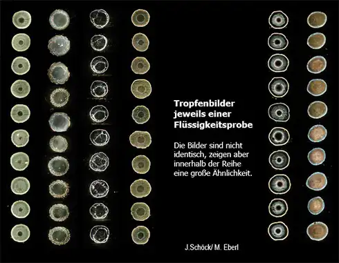 Der „Mehrpersonenversuch“: Dazu werden die auftropfenden Personen (ca. 10 ) in einem Hörsaal im Abstand von mindestens 1,5 m platziert, um Interaktionen auszuschließen. Jeder füllt selbst eine Einwegspritze mit dem Testwasser, das aus der Wasserleitung des Hauses stammt und betropft zwei Objektträger mit jeweils 14, möglichst kleinen Tropfen. Der Vergleich zeigt, dass die Tropfenbilder von jedem Auftropfenden untereinander große Ähnlichkeit in Struktur und Farbe aufweisen, während sich die Bilder verschiedener Personen zum Teil deutlich unterscheiden. (jede Reihe entspricht einer Person)