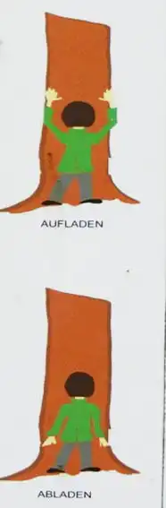 AUFLADEN: Bitten sie den Baum zur Abgabe von Energie. Halten sie die Arme nach oben mit den Händen an der Borke. Halten sie die Stirne möglichst nahe an den Stamm und atmen sie siebenmal tief durch.