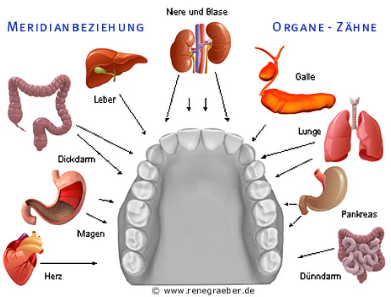 Aus ganzheitlicher Sicht wird es noch komplexer. In der traditionellen chinesischen Medizin und der biologischen Zahnheilkunde geht man davon aus, dass jeder Zahn über Energiebahnen (Meridiane) mit bestimmten Organen und Körpersystemen verbunden ist.