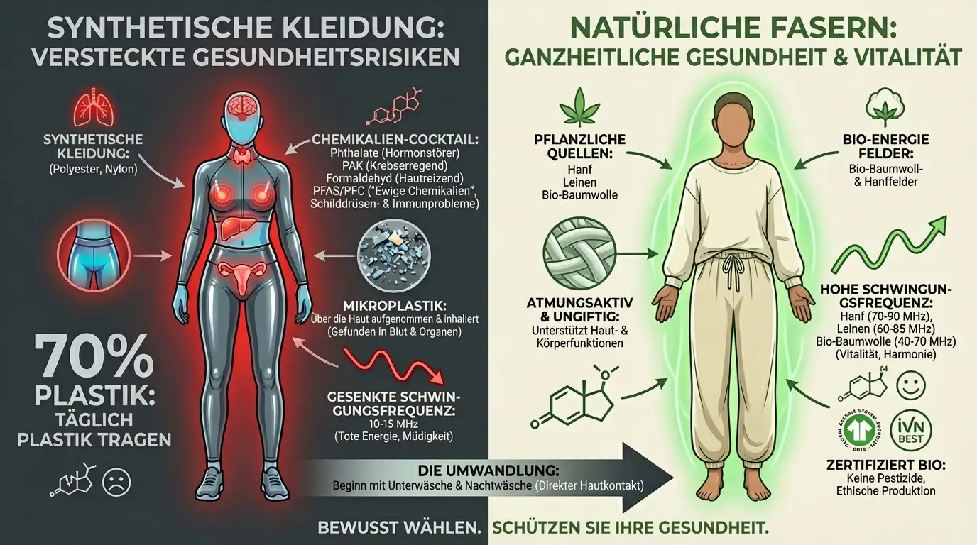 Die Wissenschaft bestätigt, was ich in der Praxis sehe: Unsere Haut ist keine undurchdringliche Barriere, sondern ein hochdurchlässiges Organ, das kontinuierlich Substanzen aus unserer Umgebung absorbiert. Kleidung ist dabei einer der größten Faktoren, weil wir sie 24 Stunden am Tag, sieben Tage die Woche tragen. Jeder Tag in synthetischer Kleidung ist ein Tag, an dem Dein Körper mit Toxinen bombardiert wird und Deine Schwingungsfrequenz gesenkt wird. Jeder Tag in natürlicher Kleidung ist hingegen ein Tag, an dem du deine Gesundheit aktiv unterstützt und Dein Energiefeld stärkst.