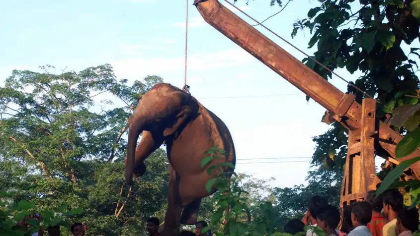 Ein toter Elefant wird von den Gleisen gehoben, nachdem er von einem Güterzug beim Überqueren der Bahngleise getroffen wurde.