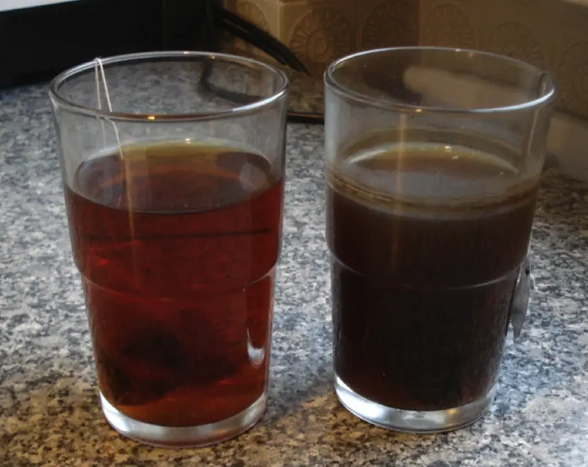 Tee nach 24 Stunden im Vergleich: Links Leitungswasser pur, rechts gereinigtes Wasser